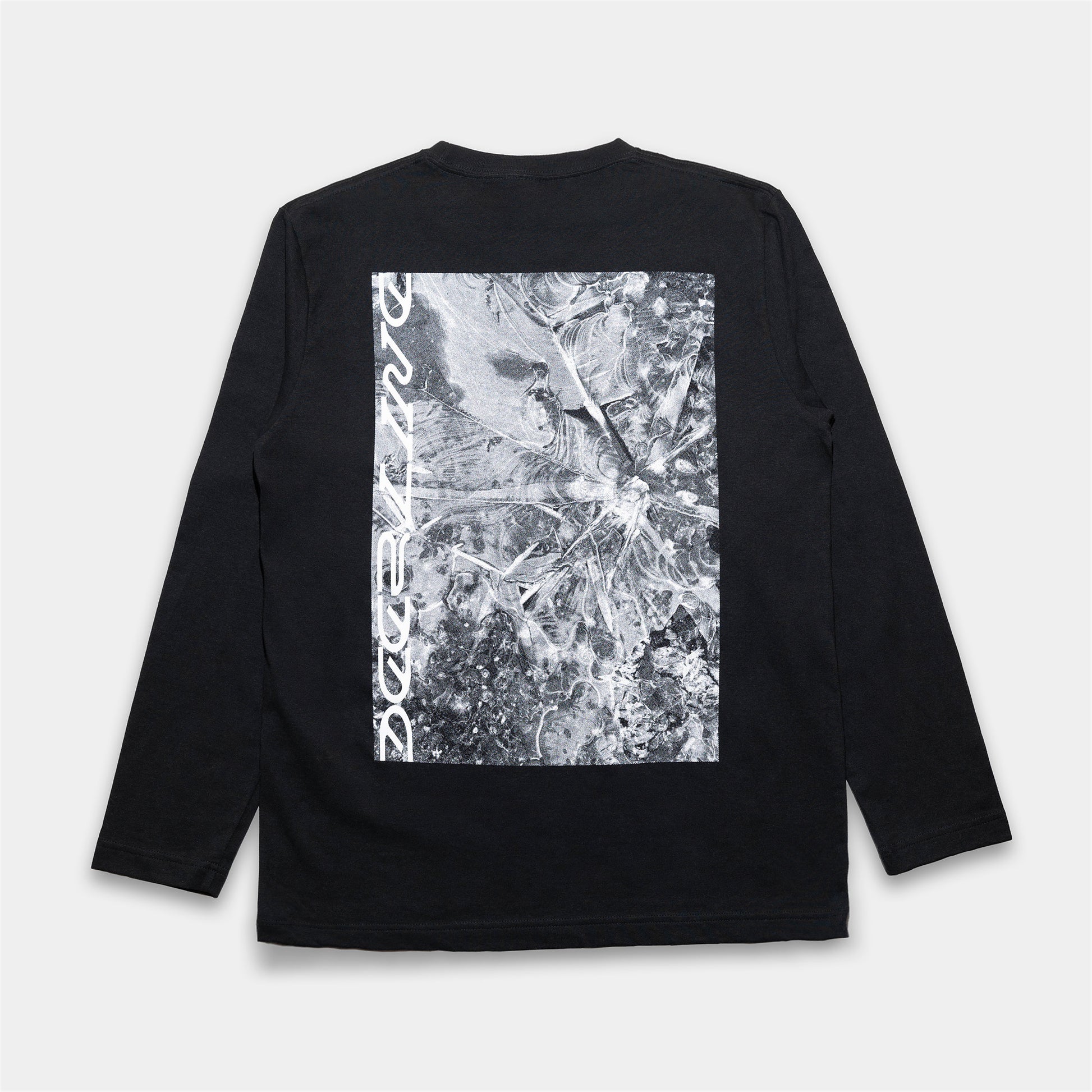 冬の仙台市街にできる凍った水たまり。その上に落ちた石によって走るヒビが、放射状にラインを描いています。その景色を写真で切り取り、シルクスクリーンプリントで背面に落とし込みました。前面には「Dロゴ」のワンポイント刺繍。東北の冬の記憶を、静かにまとう一枚です。
