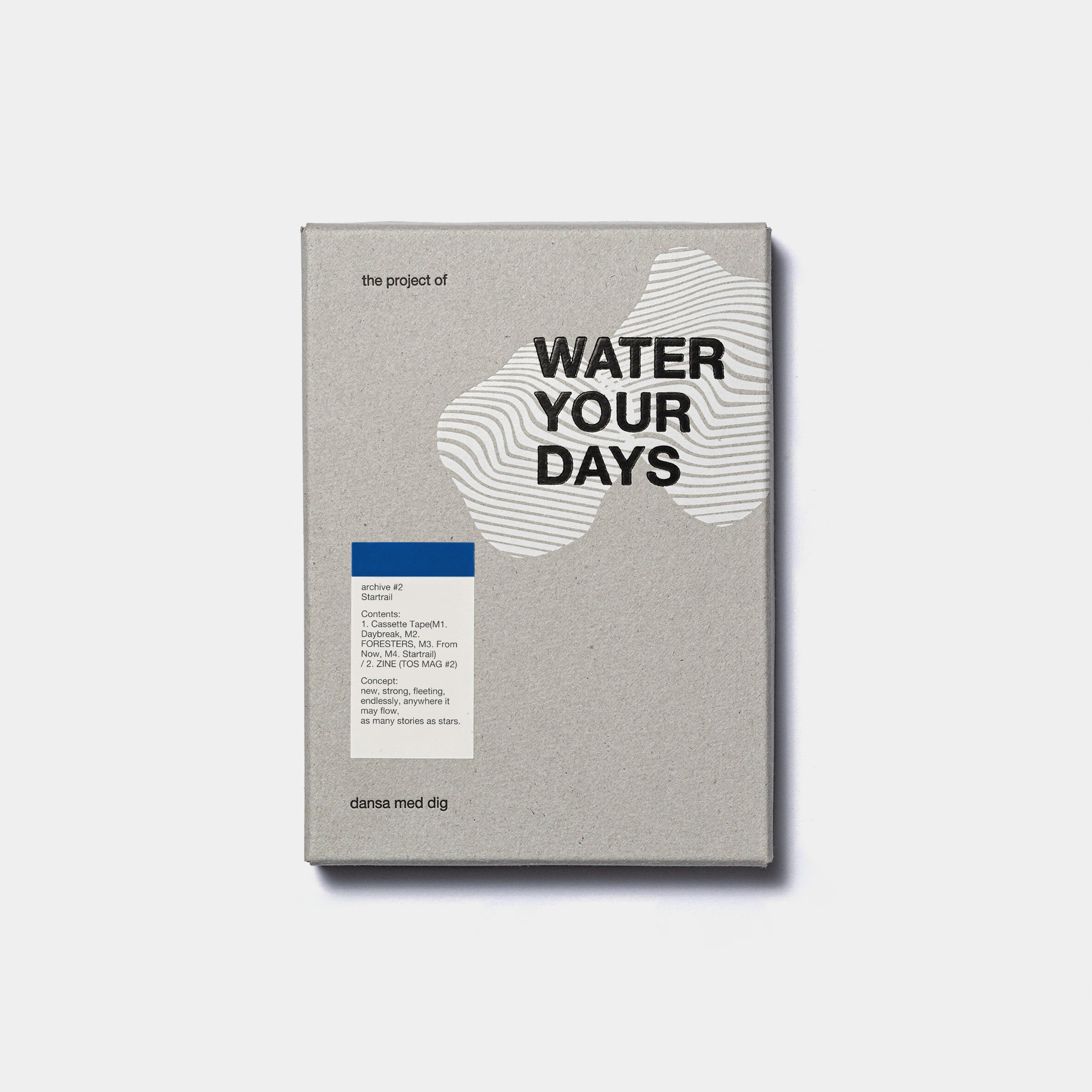 様々なカタチの表現に挑戦すべくdansa med digが続けているプロジェクト「WATER YOUR DAYS」のアーカイブシリーズ第二弾。取材、撮影、執筆、デザインをはじめ、オリジナルボックスの箔押し、組み込みに至るまで、全てをメンバーの手で行った、カセットテープとZINEのボックスセット。